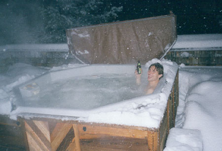Chris, enjoying a cold one and getting snowed on in the hot tub at the house we rented.